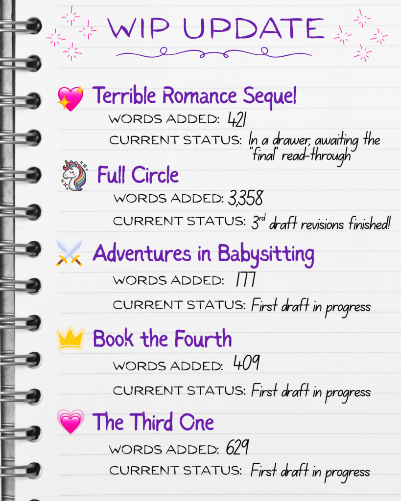 Two notable things in the WIP department. First, I somehow manage to add 421 words to the Terrible Romance Sequel—a manuscript that’s been in the drawer since the end of 2025. And what’s more—I honestly have no idea what I added/changed. Here’s hoping it was good, though. I’ll find out this month…(more on that in a minute.)