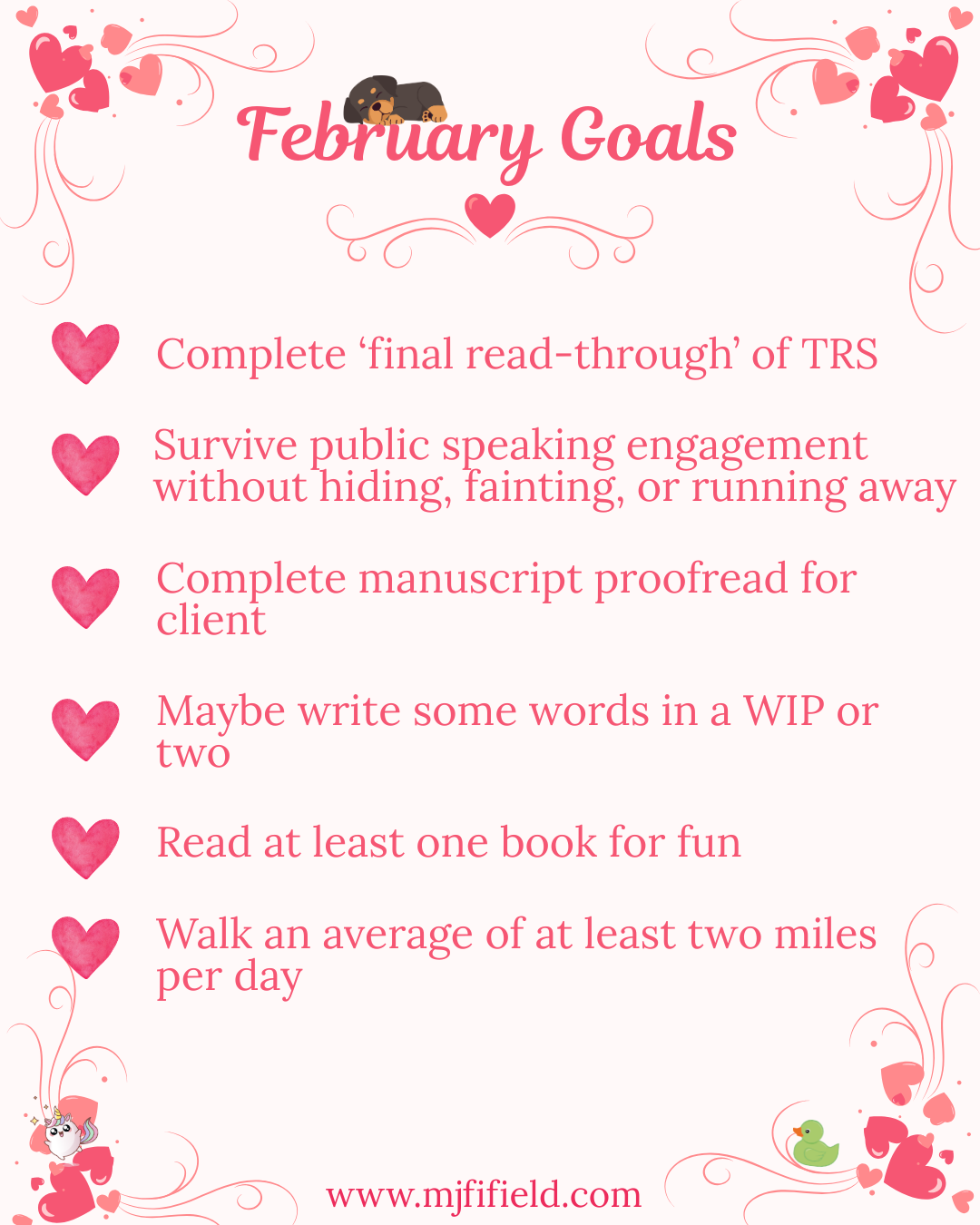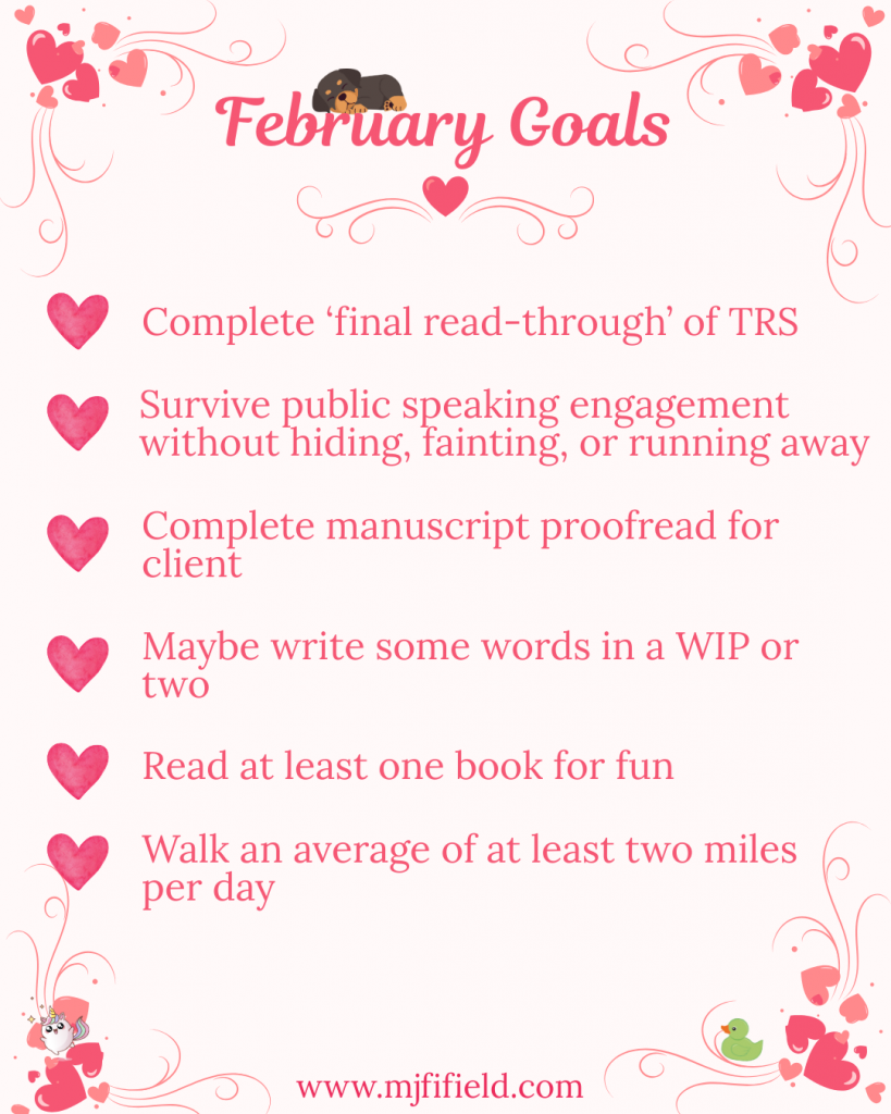 The Terrible Romance Sequel: This is meant to be the ‘final’ read-through with an eye toward publication in April. I won’t be able to start reading it until after Valentine’s Day, so I don’t know if I’ll finish the read-through before the end of the month, but we’ll see. I also don’t know how I’ll feel about the story, so that’ll be interesting, too.