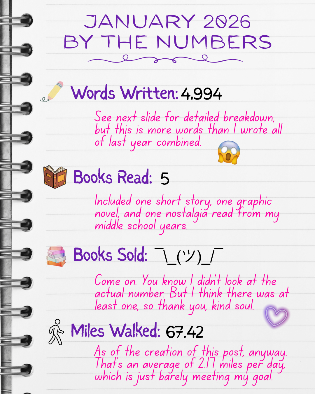 The second notable thing is the progress made on Full Circle. This project has been in the doldrums for a while now, as I spent 2025 attempting (and failing) to figure out how to fix some issues with the story. I eventually stopped looking at it altogether last year, but took it out of the drawer in January, I muddled my way through some changes, found a place for my long-desired and totally necessary Dancing Queen reference (IYKYK), and accomplished enough that I felt okay saying that this latest round of edits/revisions was complete…for now. I’m not convinced that one of the storylines is where it needs to be yet, but the manuscript needs to sit in a drawer for a while so I can go back and look at it later (probably not before May) with fresher eyes and see how it feels then.